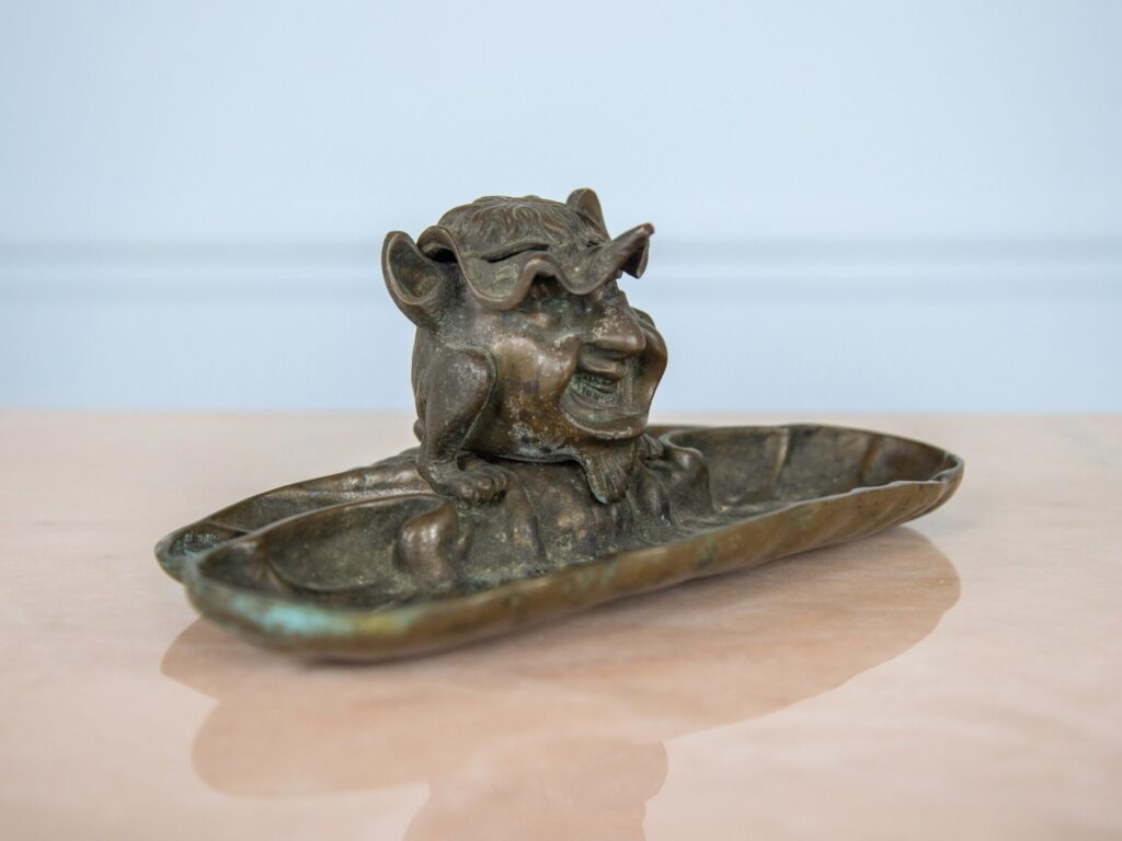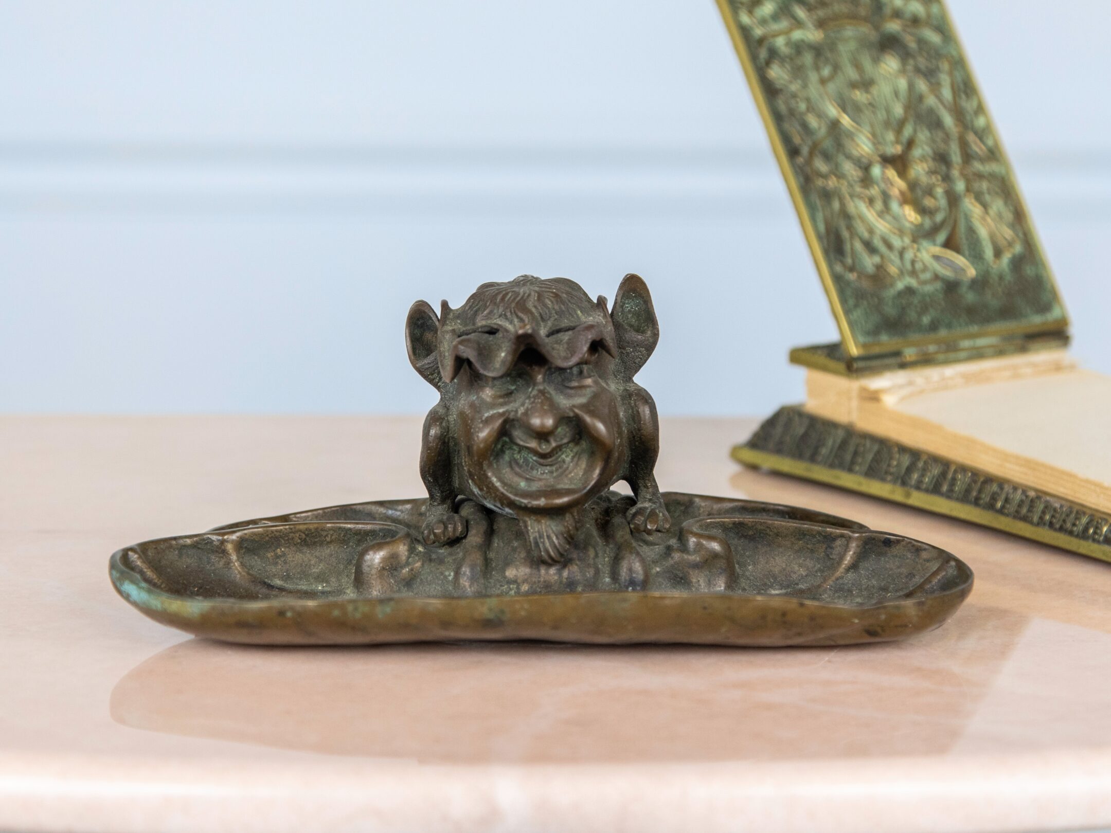 Антикварна чорнильниця виготовлена з бронзи в техніці художнього литва. Скульптурна бронзова чорнильниця датується приблизно 1900 роком і зображує дивну маленьку істоту, що сидить на тримачі для ручок у формі мушлі. Маленький гоблін має маску диявола на голові. Піднявши цю маску, ми відкриваємо резервуар для чорнила. Його вуха порожнисті, щоб вмістити два пера. Рідкісний, оригінальний та виразний предмет, він стане яскравим акцентом на письмовому столі або в колекції антикварних письмових приладь.