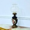 Витончена антикварна лампа на литих бронзових ніжках. Основа виробу майстерно виготовлена з порцеляни, кобальтове тло якої доповнює дивовижної краси квітковий ручний розпис у вигляді пишного букета, що оформлений у резерв з золотим обрамленням. Верхня частина складається з колби, яку прикриває плафон з гравіюванням. На сьогодні світильник електрифікований та розрахований на звичайну розетку 220 Вт. Функціональний та неординарний предмет, який зачарує своїм шармом та не залишить нікого байдужим.