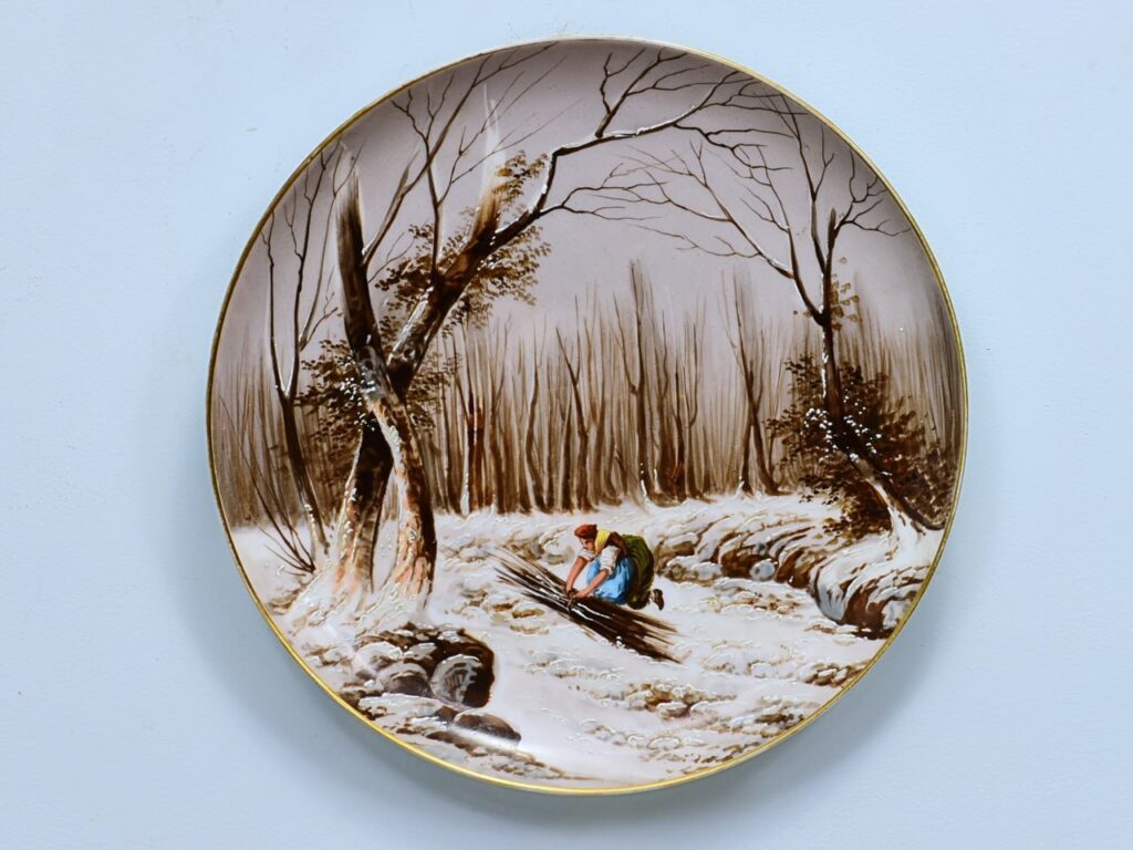 Рідкісна антикварна тарілка з художнім розписом мануфактури CFH/GDM. Предмет класичної круглої форми виконаний з високоякісної порцеляни з зображенням природного зимового пейзажу та дівчини, яка збирає хмиз. На зворотній стороні виробу є клеймо, що вказує на мануфактуру Haviland, засновану американцем Девідом Гавіландом у 1842 році. Верхня частина CHF – ініціали одного з синів Чарльза Філда Гавіланда. Подібний розпис наносився на вироби з 1881 по 1900 рік.