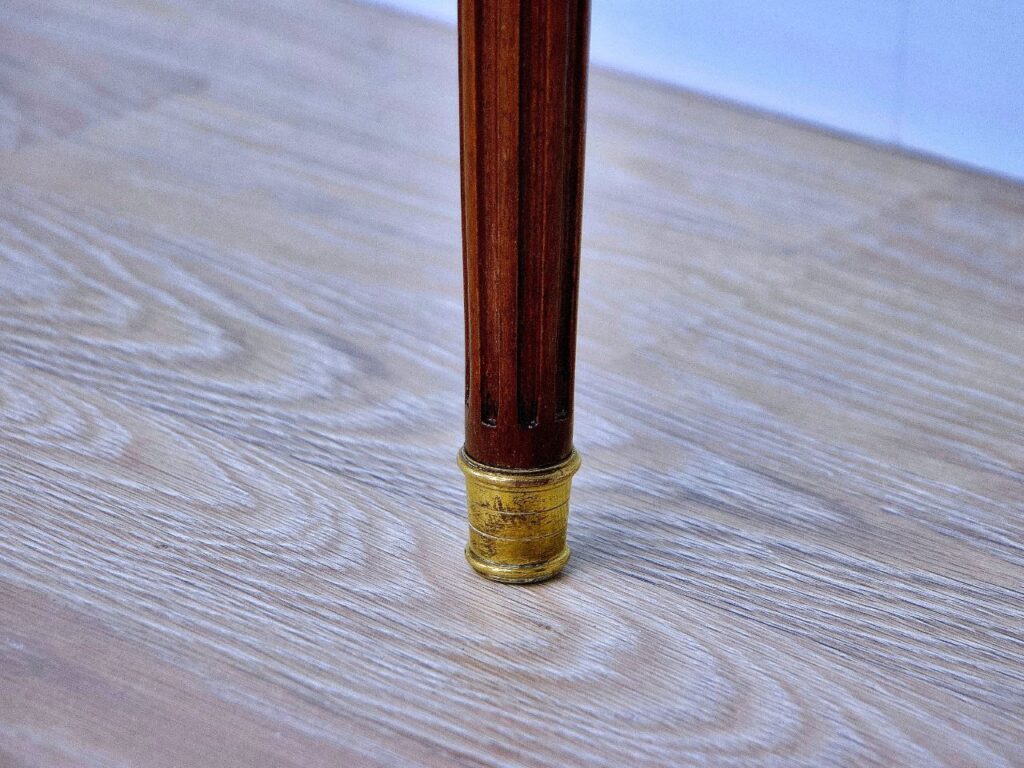 Вишукана антикварна консоль з тонкими канелюрованими ніжками, які створюють неймовірні пропорції предмета. Фриз виготовлений у вигляді геометричного прорізного орнаменту та доповнений металевими вставками по кутах. Мармурова стільниця теплого відтінку підкреслює колорит дерева.