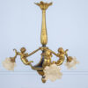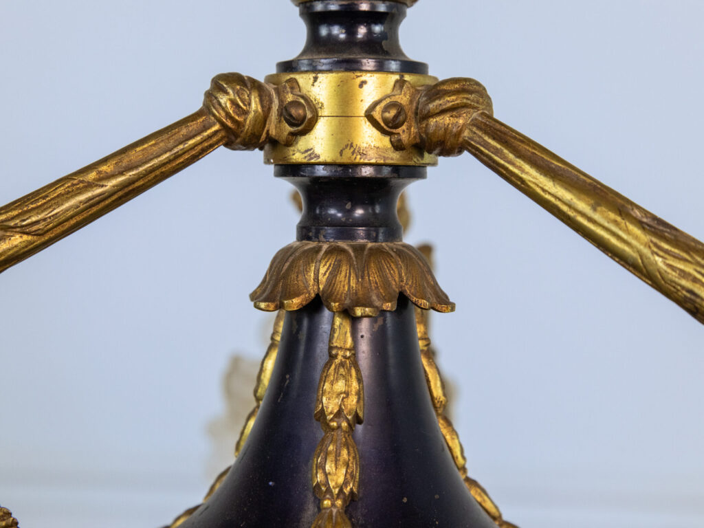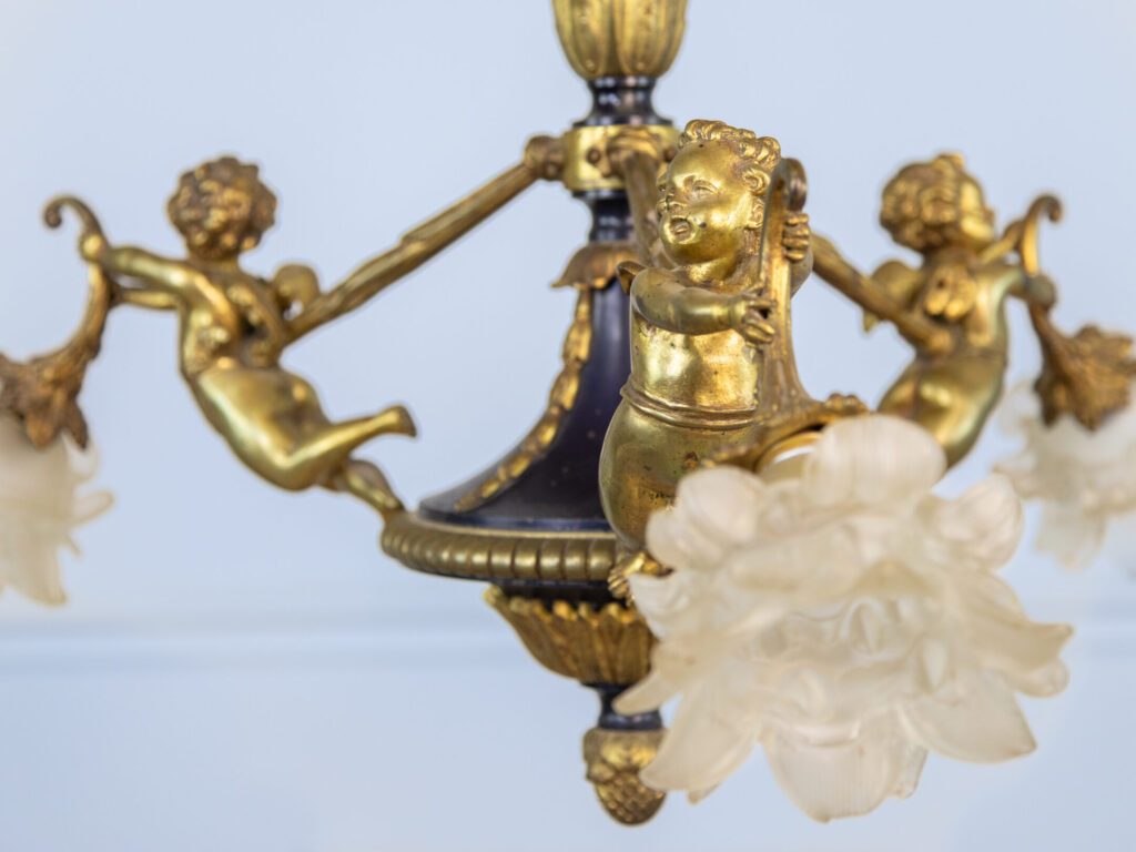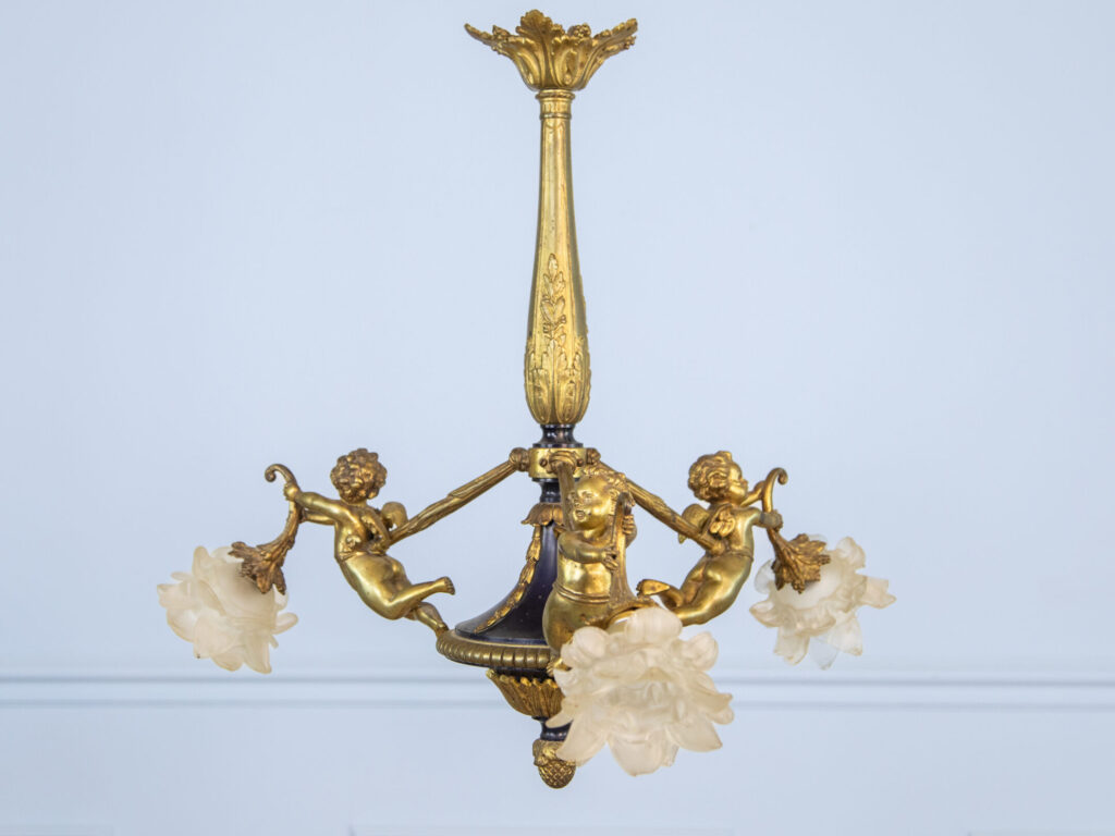 Дивовижної краси антикварна люстра. Предмет цікавий своєрідним поєднанням основи чорного кольору в стилі ампір у техніці обробки металу «толь» та елементами епохи Людовика XVI, зокрема рослинною розеткою та опорою з рослинним орнаментом із золоченої бронзи. Головна прикраса виробу – три майстерно створені фігурки путті, які тримають плафони-квіти з матового скла. Люстра забезпечить рівномірне та естетично гарне освітлення приміщення. Унікальний предмет декору, який не залишить нікого байдужим і чудово доповнить класичний стиль інтер’єру.