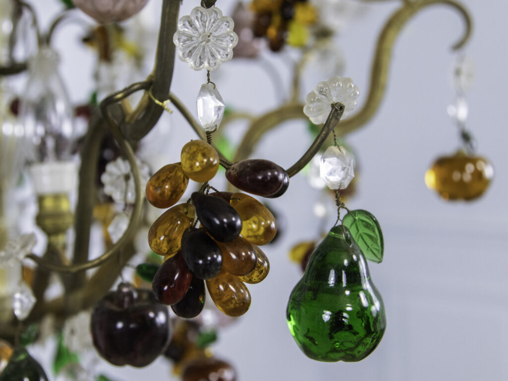 Бронзова люстра з декором з муранського скла на 11 вогнів. Має чудову композицію з апетитних фруктів. Яблука, груші та виноград розвішані наче на райському дереві, разом з прозорими кришталиками та квітами створюють соковиту композицію, яка стане окрасою оселі. Гілки люстри завершують елегантні ложа для елементів освітлення. Мистецтво створення муранського скла зародилося в Італії багато століть тому. За цей час ремесло переживало різні часи: забувалося і відроджувалося знову. У 1859 році Антоніо Сальвіаті відкрив фабрику для виготовлення кольорової смальти, згодом його компанія «Salviati & Co» здобула популярність по всій Європі. Вони зібрали традиції венеційських склодувів та використовували їх у створенні своїх шедеврів. Насичений та чистий колір кришталевих виробів досягався лише з використанням натуральних мінеральних пігментів.