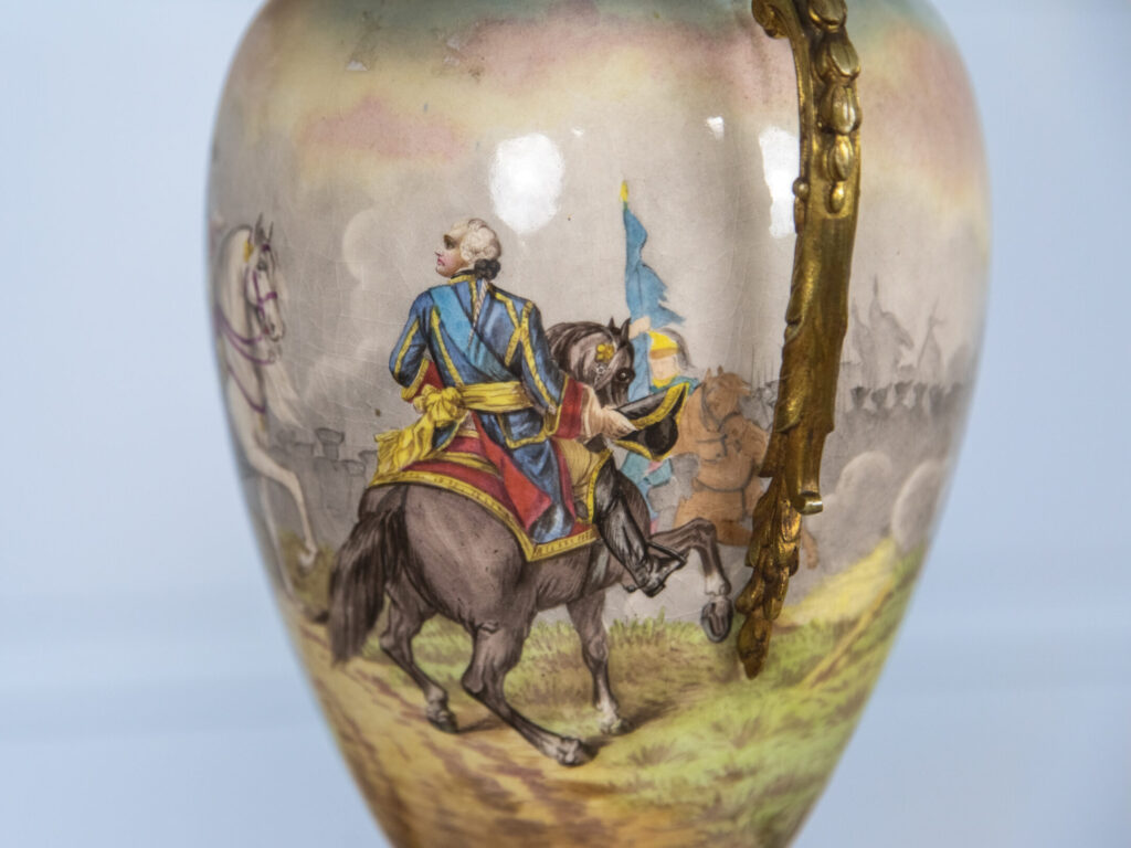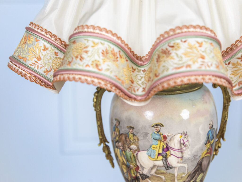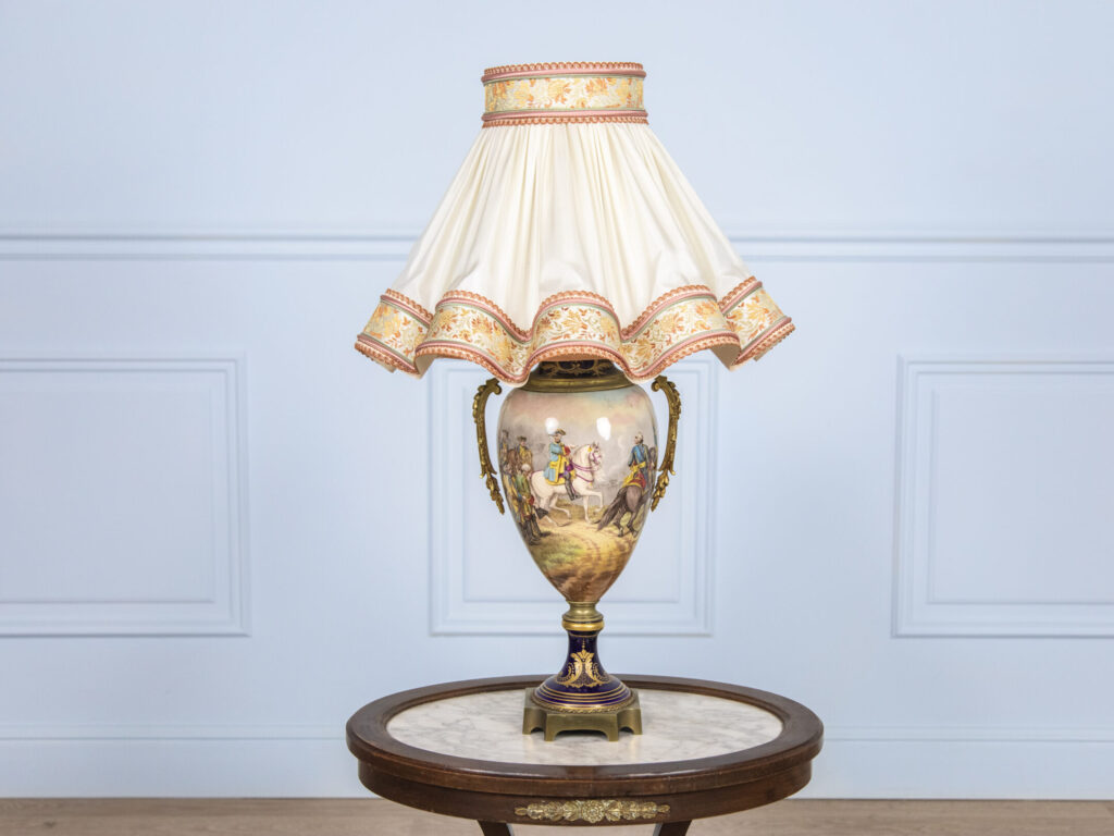 Вишукана антикварна настільна лампа у стилі Севр з детальним ручним розписом. Декор включає жанрову військово-історичну сцену на фоні ідеалізованого сільського пейзажу – типовий мотив для порцеляни другої половини XIX століття, що поєднує романтизм і історичну тематику. Основу лампи прикрашають декоративні бронзові накладки – зокрема, витончені ручки у вигляді стилізованої рослинності. Ніжка оформлена глибокою синьою емаллю з позолоченим орнаментом. Світильник доповнено текстильним абажуром кремового кольору з гофруванням та золото-теракотовою тасьмою по краю. Цей виріб натхнений традиціями Севрської порцелянової мануфактури – одного з найпрестижніших центрів європейського декоративно-прикладного мистецтва.
