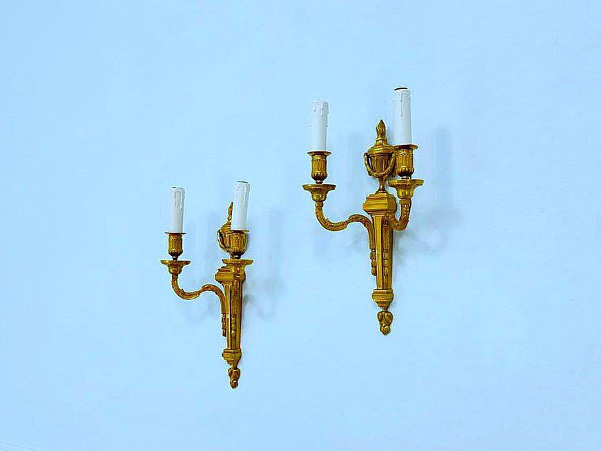 A luxurious set of antique sconces by French masters in the Louis XVI style. The lamps are skillfully executed in the form of pedestals with a vase in the technique of artistic bronze casting, decorated with with motifs of leaves, rocaille and flower inflorescences. Each object is equipped with two lamps, which ensures uniform illumination of the space.