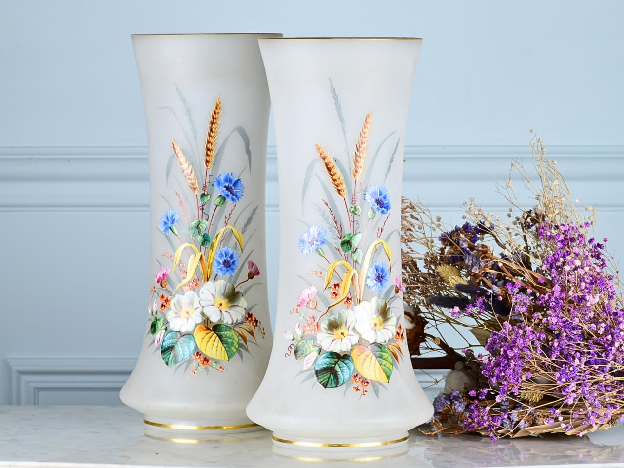 Пара ваз з опалового скла, поверхні яких витончено прикрашають флористичні розписи у вигляді композицій садових квітів, волошок та злаків, чудово доповнені обідками золотого розпису зверху і знизу. Опалове скло – унікальний матеріал, винайдений у кінці ХІХ століття, має здатність відбивати або розсіювати світло таким чином, що створюються м’які переходи від кольору до кольору або змінюється колірний відтінок. Вази у чудовому стані без сколів, додадуть затишку будь-якому сучасному або класичному стилю інтер’єру.