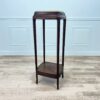 Антикварна підставка у лаконічному виконанні, виготовлена з масиву палісандрового дерева. Стільниця оздоблена плитою з жовтуватого мармуру. Довгі тонкі ніжки закріплені нижньою поличкою для більшої стійкості. Підставка має чудовий стан та міцну конструкцію.