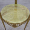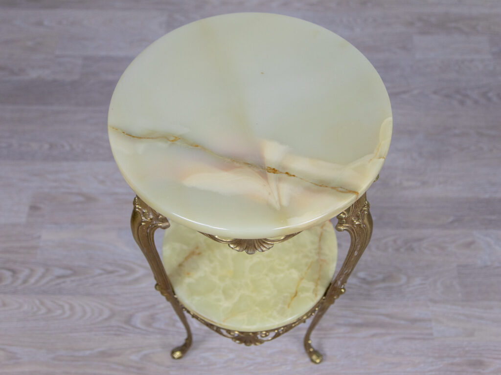 Витончений столик-підставка зі стільницею та поличкою з оніксу на бронзових ніжках. Фігурні ніжки з рельєфним оздобленням з мушель, рослинних елементів та завитків мають цільну конструкцію. Чудовий декоративний елемент вишуканого інтер’єру, який чудово підійде під кашпо з квітами чи скульптурну композицію. Столик у хорошому стані.