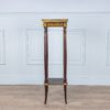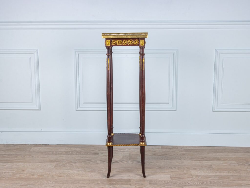 Антикварна підставка є прекрасним зразком мистецтва і ремісничої майстерності другої половини ХІХ століття. Вона має розкішний зовнішній вигляд завдяки складним золотим візерункам та орнаментам, які прикрашають поверхню і ніжки. Усі металеві деталі – з бронзи, що дозволило досягти високої деталізації та точності рельєфів. Плато квадратної форми обрамлене високим прорізним орнаментальним паском, є додаткова полиця знизу. Різьблені ніжки надають елегантного вигляду.