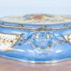 Антикварна порцелянова шкатулка для коштовностей. Предмет натхнений зразками ХІХ століття з фабрики Мейсен. Дуже гарний ручний розпис емалями у вигляді квіткового декору, доповнений позолотою на блакитному тлі. Всередині шкатулка також прикрашена ручним розписом. Неможливо точно визначити регіон, в якому створена ця річ, проте розпис наслідує традицію німецької порцеляни, зокрема центральний резерв оздоблений так званим «мейсенським букетом». На дні присутнє надглазурне золоте клеймо у вигляді двох схрещених мечів. Шкатулка в хорошому стані, відповідно до віку.