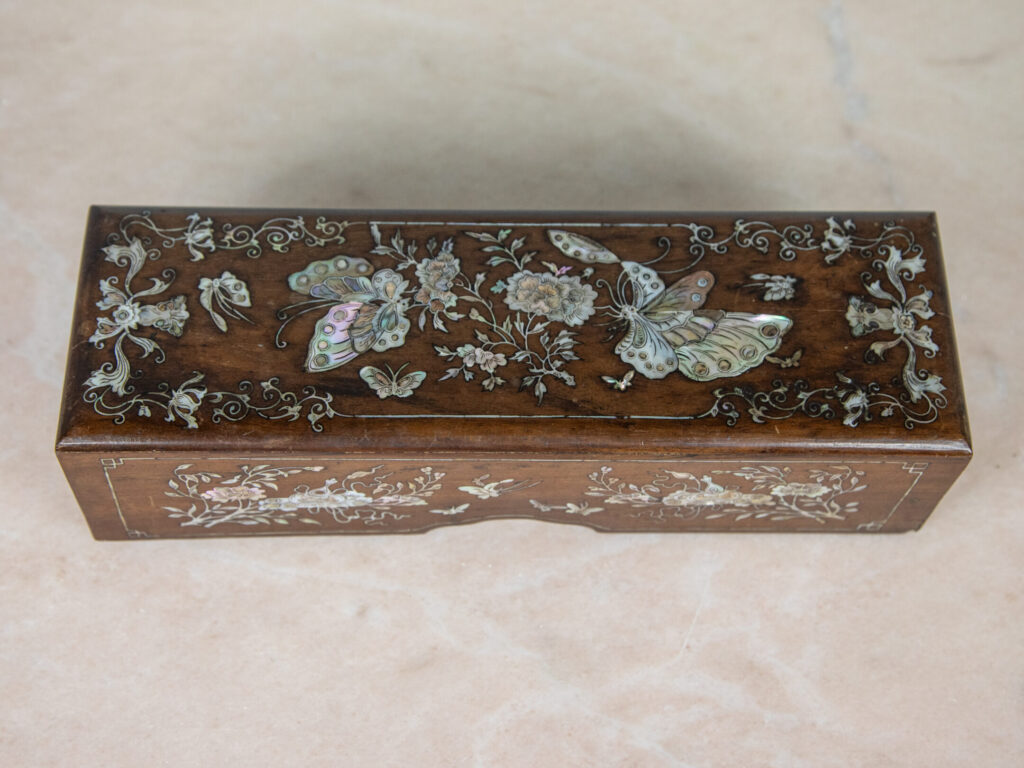 English description: We bring to your attention an exquisite antique box in the Asian style, dating from the late nineteenth century. The product is a rectangular box with rounded corners made of solid exotic wood, decorated with hand-inlaid mother-of-pearl of incredible beauty in the form of a naturalistic composition of floral weaving with garden flowers and butterflies. This object is unique in its kind, which is perfect for storing memorabilia, manuscripts, jewellery, work supplies, etc.