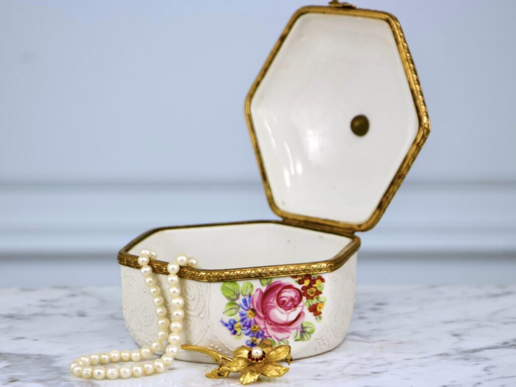 Антикварна порцелянова шкатулка неймовірної краси, оздоблена ручним квітковим розписом та обʼємним візерунком з білої пасти. Порцеляна доповнена оздобленням із золоченої бронзи.