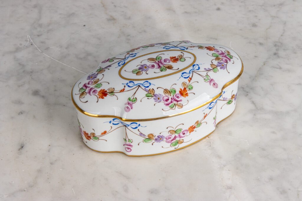 A small porcelain box of complex shape was created in the middle of the twentieth century in Limoges. The object is decorated with delicate floral ornaments with thin ribbons. The decor is complemented by a gilded frame. There is an artist's signature and a manufactory mark on the bottom.