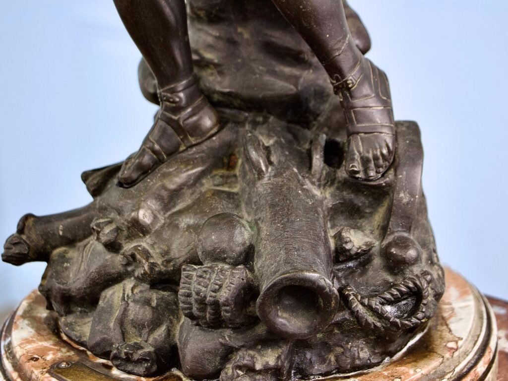 Антикварна скульптурна композиція, створена за моделлю Віктора Руссо «Gloire au vainqueur» («Слава переможцю»), виготовлена з темної патинованої бронзи. Підніжжя вирізане з темно-зеленого мармуру. Скульптура є прикладом декоративної інтер’єрної композиції в стилі романтизму, для якого був характерний акцент на зображенні сильних почуттів та характерів. Скульптура зображає воїна, який впевнено стоїть на полі бою та переможно простягає руку з мечем вгору, за яку його тримає Ніка – крилата богиня перемоги в давньогрецькій міфології. Тип такої скульптури може бути як самостійним витвором мистецтва, так і декоративною частиною оформлення інтер’єру.