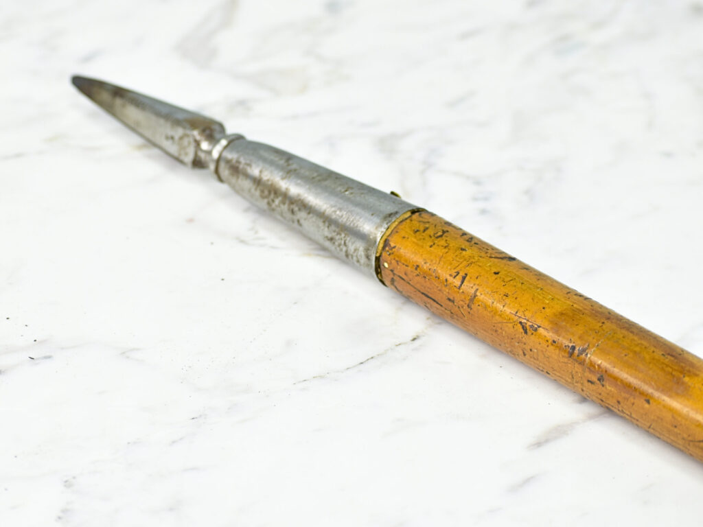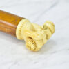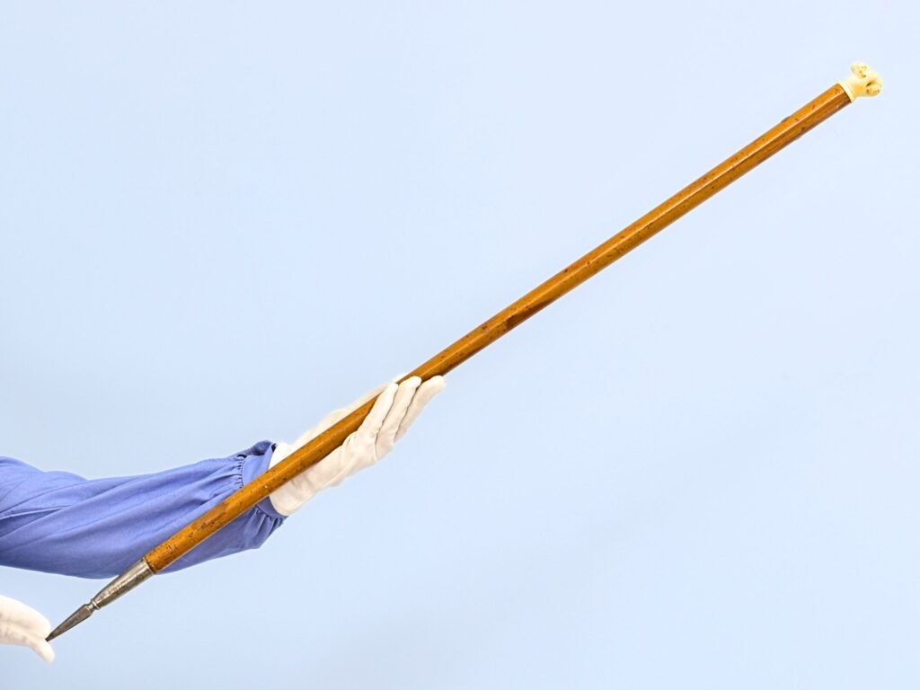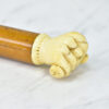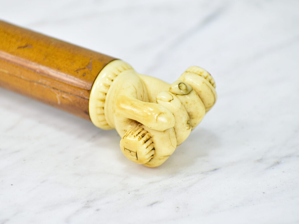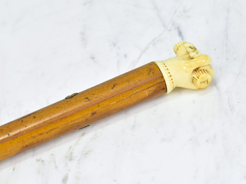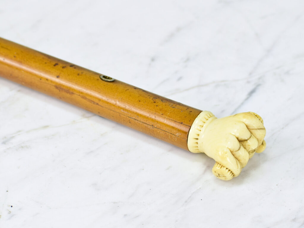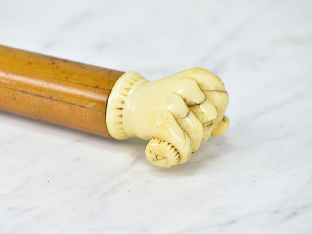 This antique cane carries a symbolic and political character — it features an ivory handle carved in the shape of a clenched hand holding a parchment scroll, allegorically representing “The Charter granted to the French by Louis XVIII during the Restoration.” The wooden shaft in a warm brown tone bears the characteristic marks of age.