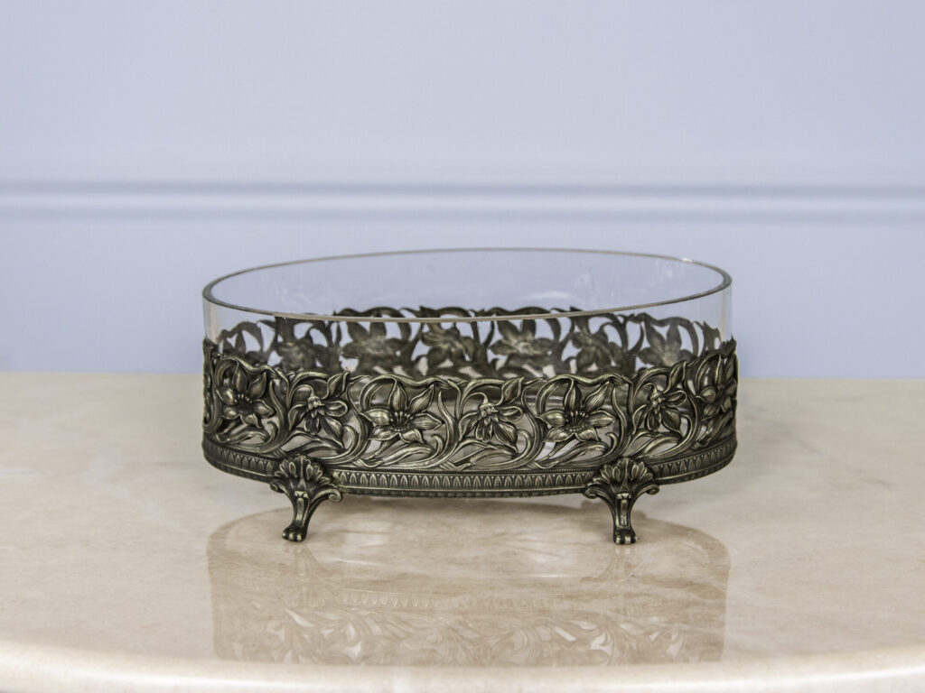 Антикварна вишукана ваза стане окрасою сервірування столу. Ємність з прозорого скла поміщена в металеву оправу неймовірної краси, яка має вигляд рельєфного візерунка, що зображує ніжні квіти.