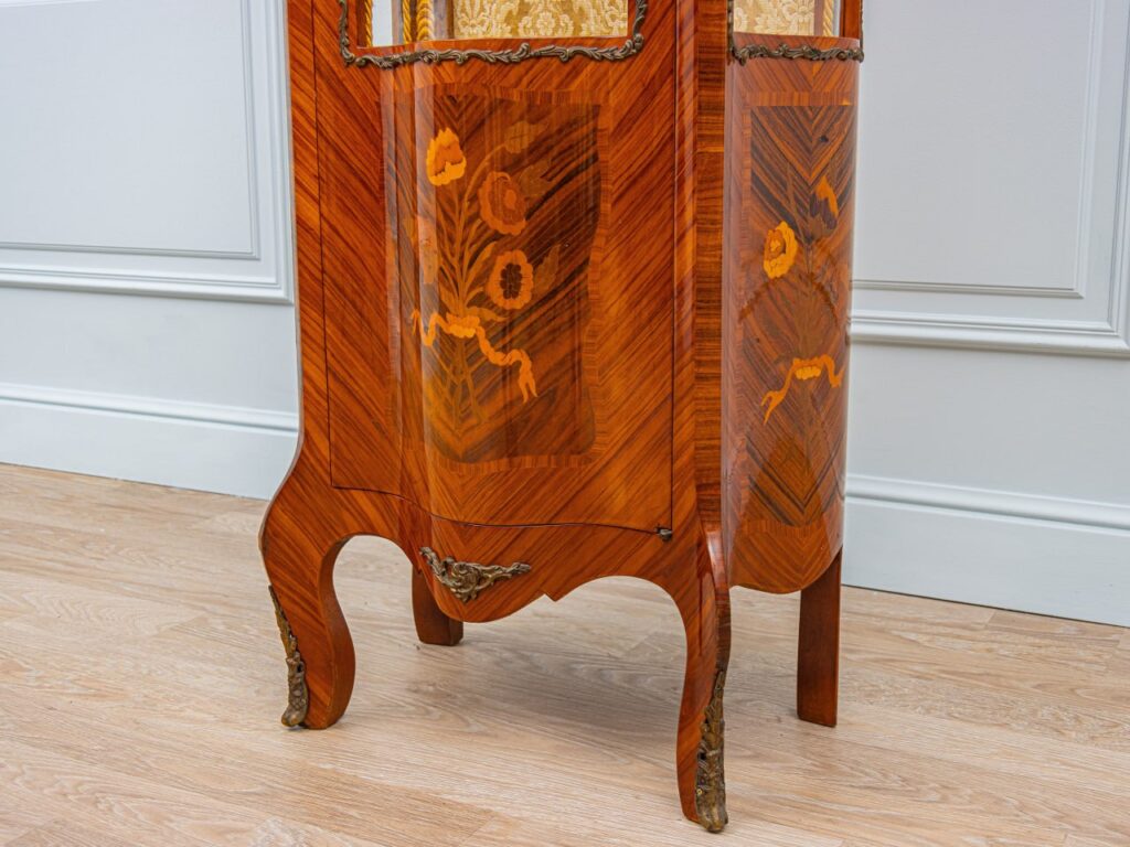 Витончена антикварна вітрина з масиву деревини, яка має чудове декорування в техніці маркетрі на фасаді та боках у вигляді квіткових букетів, перевʼязаних стрічками, та оздоблення по периметру бронзовими накладками з елементами природних орнаментів. Усередині стінки вітрини оббиті тканиною. Вітрина має три скляні полиці для ефектної демонстрації колекційних предметів, посуду та фотографій. Це універсальний предмет, який чудово виглядатиме у вітальні, кабінеті чи бібліотеці, в класичних стилях інтер’єру.