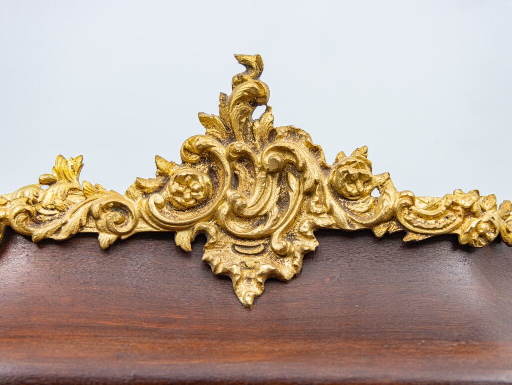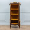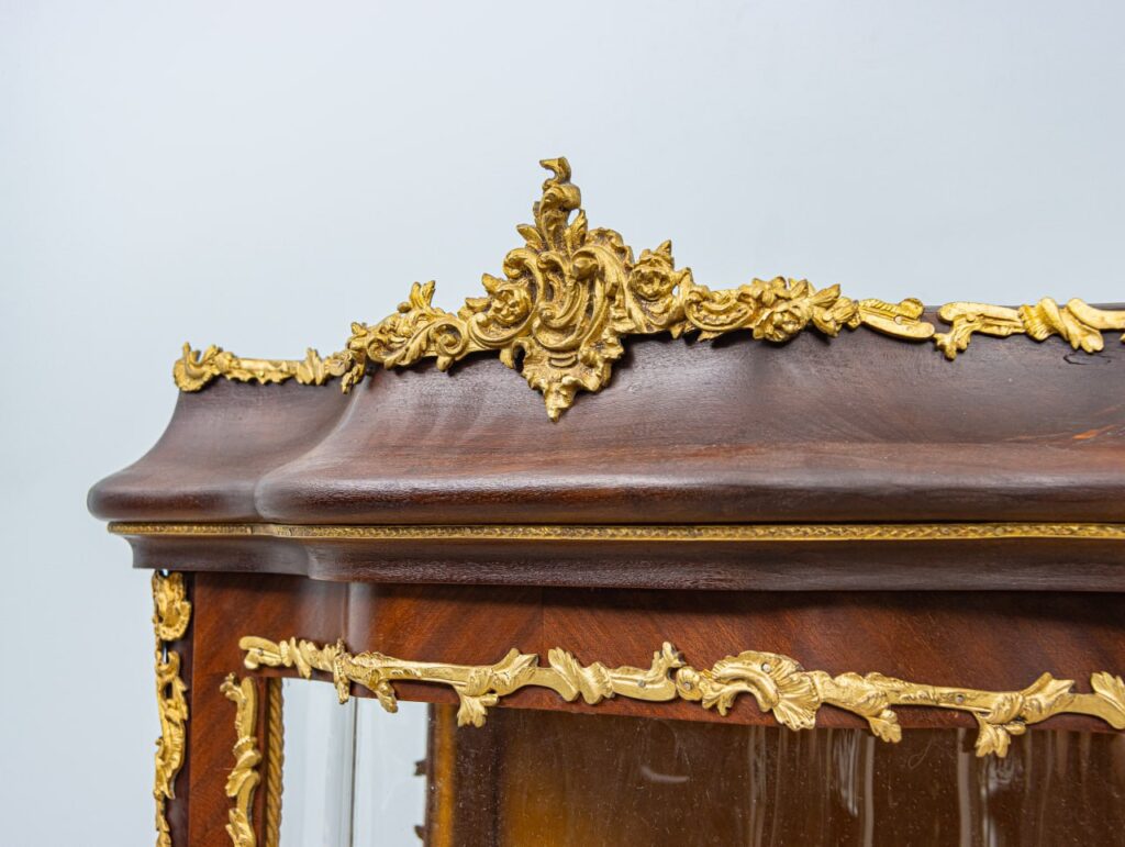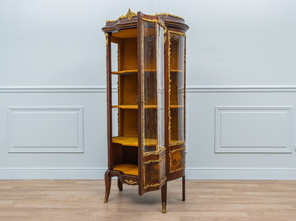 Вражаюча французька антикварна вітрина. Даний предмет має чудовий оригінальний вигляд і багато характерних цікавих деталей, таких як витончені позолочені бронзові накладки у вигляді лапок на увігнутих ніжках, обрамлення скла, верхня корона з візерунками. Унікальна деталь на виробі – розписана вручну панель з зображенням галантної сцени, де кавалер дарує білу троянду дівчині посеред квіткового саду. Всередині вітрини розміщуються три знімні полиці, оббиті жовтим оксамитом, для естетичного та безпечного зберігання посуду та інших предметів побуту. Буде хорошим доповненням до колекції антикваріату та гарно підійде для вітальні, класичного кабінету або виставкового залу музею.