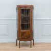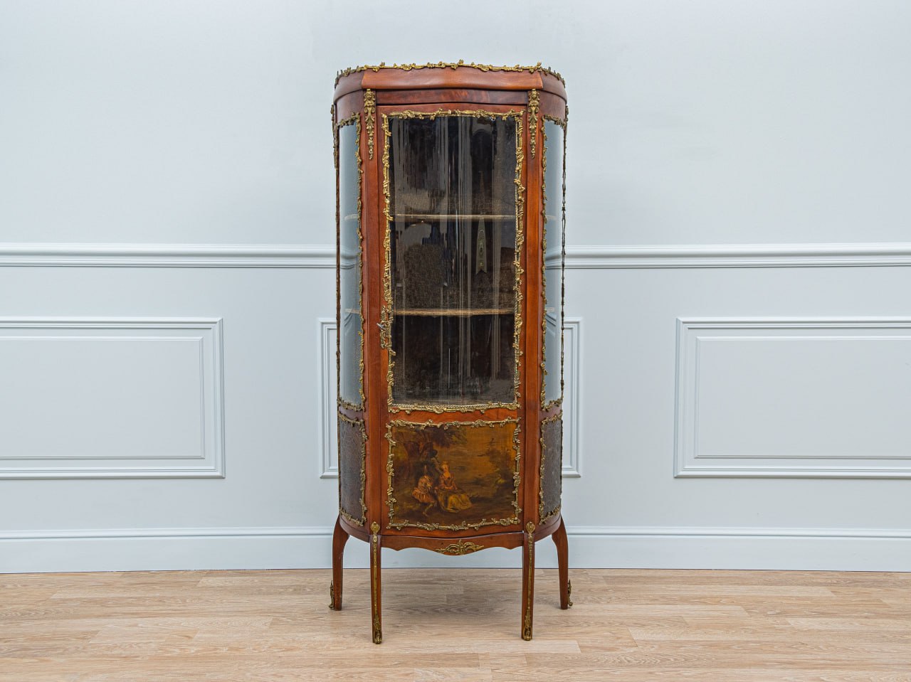 Антикварна вітрина виготовлена з червоного дерева у стилі Людовика XV відсилає до меблів братів Мартінів. Витончений декор з золоченої бронзи та майстерно виконаний художній розпис ручної роботи з зображенням пасторальної сцени на тлі мальовничого пейзажу охоплює весь периметр фасаду вітрини. Усередині розміщуються три знімні полиці, оббиті жовтим оксамитом, для делікатного зберігання порцеляни, фотографій та інших речей. Предмет чудово виглядатиме в інтер’єрі.