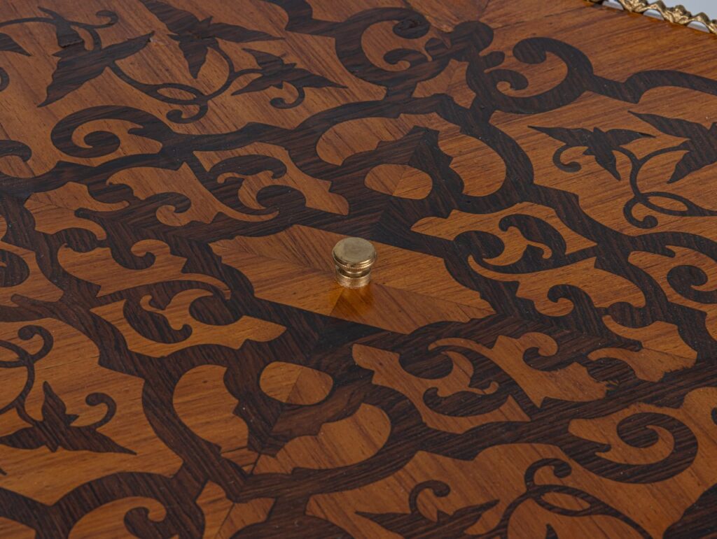 Фігурна жардиньєрка з кришкою, на чотирьох ніжках типу кабріолей, декорована в техніці маркетрі. Маркетрі виготовлене у контрастних відтінках, орнаментами з мотивами арабесок. Бронзові накладки мають чудове виконання, верхівʼя увінчане невисоким перфорованим фризом.