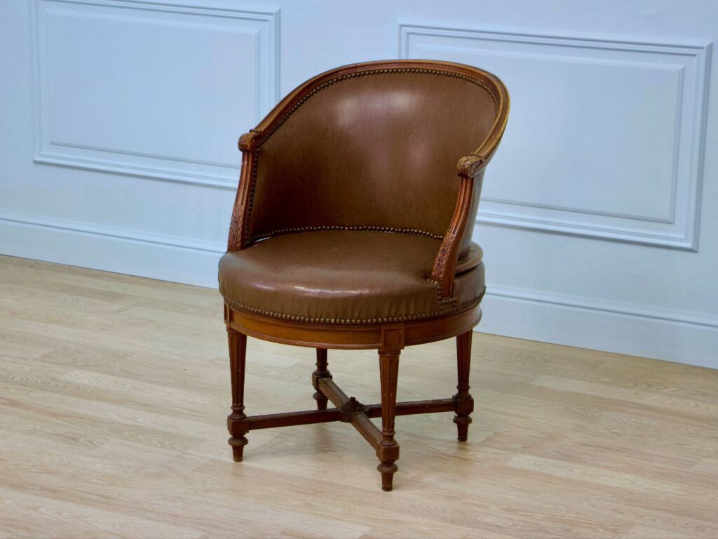 Розкішне та зручне кабінетне крісло виготовлене з масиву дерева та прикрашене різьбленими декоративними деталями. Ніжки предмета поєднані х-подібною перетинкою. Сидіння, спинка та підлокітники утворюють цільну конструкцію що надає зручності у використанні. Крісло обтягнуте шкірозамінником кольору молочного шоколаду. Предмет універсальний – підійде до різноманітних інтерʼєрів, може стати влучним доповненням кабінету.