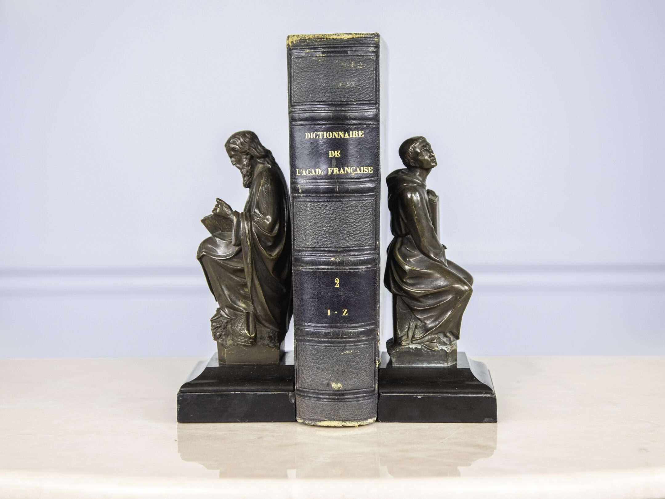 Антикварні обмежувачі для книг виготовлені з бронзи в техніці художнього литва. Обидва персонажі є представниками духовенства, проте один з них – чернець, а другий – єпископ. Однак вони рівні в прагненні до знань. Це не простий декоративний елемент інтер’єру, а ще й річ, наповнена глибоким філософським змістом та символізмом.