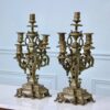 Пара антикварних канделябрів на 5 свічок з патинованої бронзи. Канделябри мають унікальну стилістику європейського Ренесансу, поєднуючи в собі лаконічні форми, зображення грифонів з лев’ячими лапами та рослинні орнаменти. Чудове доповнення до класичного інтер’єру та колекції старовинної бронзи.