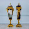Неймовірні граційні вази розписані вручну та прикрашені бронзовим золоченим декором. Резерви з ручним розписом прикрашають корпуси та кришечки ваз. Сцени натхнені античними міфами та чарівні пастельні пейзажі оформлені в золоту кайму, розміщені на тлі кольору глибокого ультрамарину. Довершеність проявляється в кожній з деталей, це речі, які хочеться розглядати годинами та кожен раз спостерігати щось нове. Бронза виконана в техніці художнього лиття та золочена за старовинною технологією. Масивні голови козлів в поєднанні з фігурними ніжками надають вазам насправді розкішного вигляду. Кришки ваз – функціональні, мають всередині світло-блакитне маркування Sévres, всередині є невелика бронзова ємність. Вази в ідеальному стані, без пошкоджень.