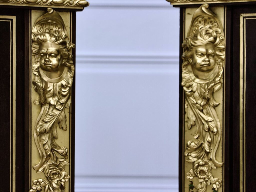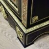 Рідкісна пара антикварних комодів, виготовлених у стилі Буль. За основу взято масив грушевого дерева, що легко піддається обробці та має високу стійкість до зовнішнього впливу. Предмети мають багатий декор із застосуванням техніки чорного лаку та інкрустацією золоченими бронзовими накладками у вигляді рослинних мотивів, античних маскаронів з бантами та мушлями. Головна прикраса та особливість стилю Буль – розкішна інтарсія з панцира черепахи та латуні, яку ідеально доповнює розпис ручної роботи. Стільниці комодів виготовлені з білого італійського мармуру, що прекрасно підійдуть для експозиції ваз, скульптур, годинників та інших предметів декору. Всередині предмети оснащені полицями для зберігання речей.