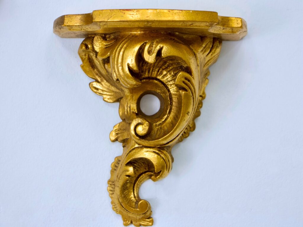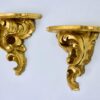 Пара невеликих золочених поличок-консолей, вирізьблених з дерева, покритих левкасом та поталем. Дерев’яні фігурні стільниці підтримуються витонченими плетивами аканта. Гармонійні пропорції поличок вдало підкреслені вишуканим кольором патинованого золота.