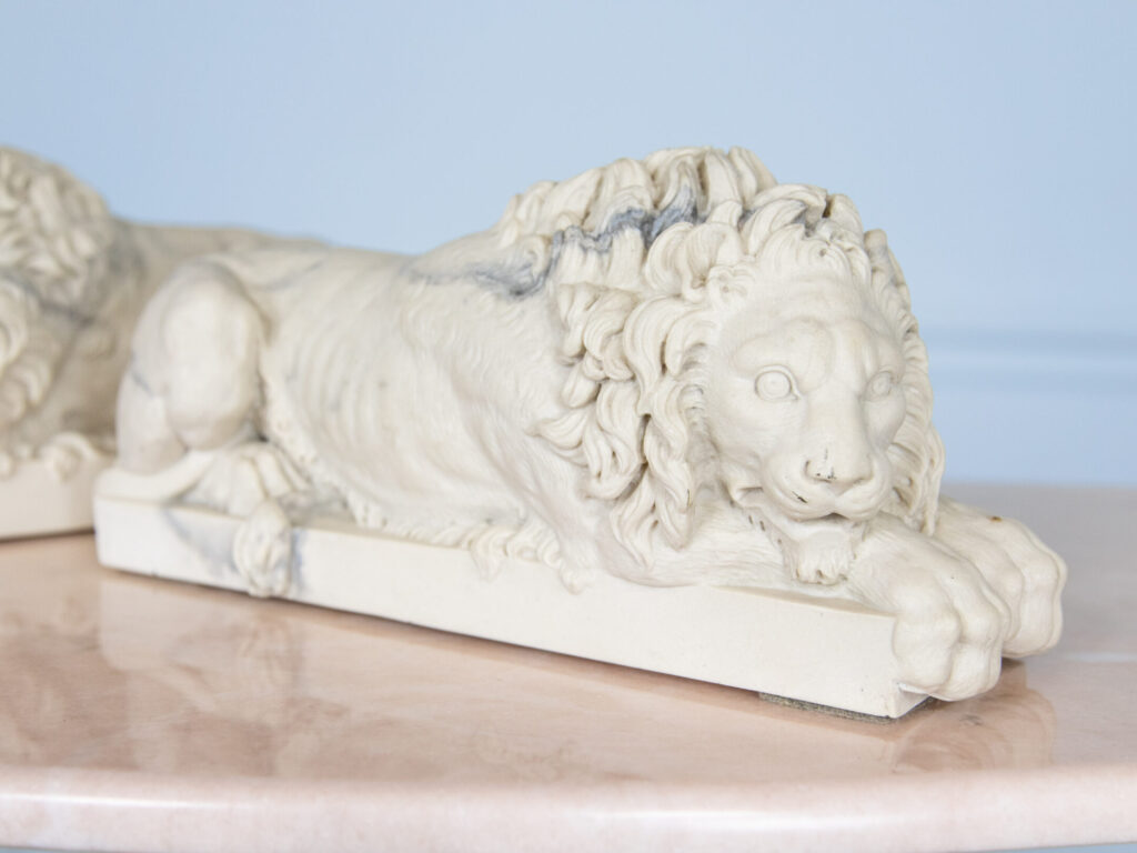 Пара декоративних скульптур, що зображує лежачих левів, виготовлених у стилі класицизму. Репродукція створена за мотивами відомих мармурових левів італійського скульптора Антоніо Канови (1757-1822), чия робота «Леви» є одним з еталонів неокласичної скульптури. Ці фігури створені з крихти мармуру з легкою патиною. Один лев має спокійний, споглядальний вигляд, інший – пильний, з напруженим поглядом. Такий контраст типовий для класичних парних композицій, що символізують баланс сили та мудрості. Скульптури можуть стати витонченим акцентом у вітальні, бібліотеці, на камінній полиці або в кабінеті. Ідеальні для поціновувачів класичного мистецтва та інтер’єру в історичному стилі.
