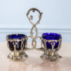 Вишукана старовинна сільничка на дві ємності з кобальтового скла. Підставка виготовлена зі срібла високої якості та позначена клеймом Minerva. Срібна оправа має вигляд плетива ліан з елементами колючого аканта.