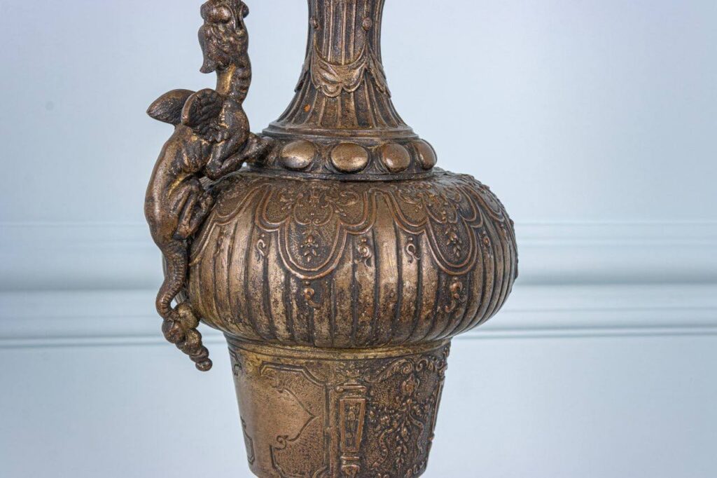 Пара антикварних декоративних ваз. Неймовірні антикварні вази-кубки зі шпіатру на оніксовому цоколі. Предмети, що наслідують форми кращих зразків декоративного посуду епохи Відродження, оздоблені неймовірними рельєфами, ручки виконані у вигляді стилізованих драконів, які вивергають полумʼя. Ця надзвичайна пара стане розкішним елементом декору оселі та буде навіювати шарм тієї епохи.