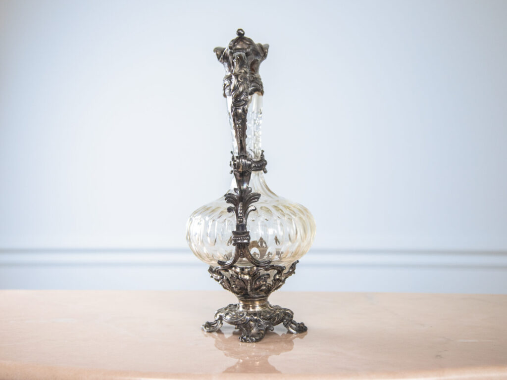 Антикварний кришталевий графин у металевій оправі, виготовлений в історичному стилі з елементами ренесансу та готики. Модель унікальна та майже не має аналогів. Кришталева колба оздоблена ручним грануванням, а металева оправа прикрашена фантастичними рельєфними елементами. Посріблення металу подекуди має потертості, що природно для виробу з більш ніж столітньою історією.
