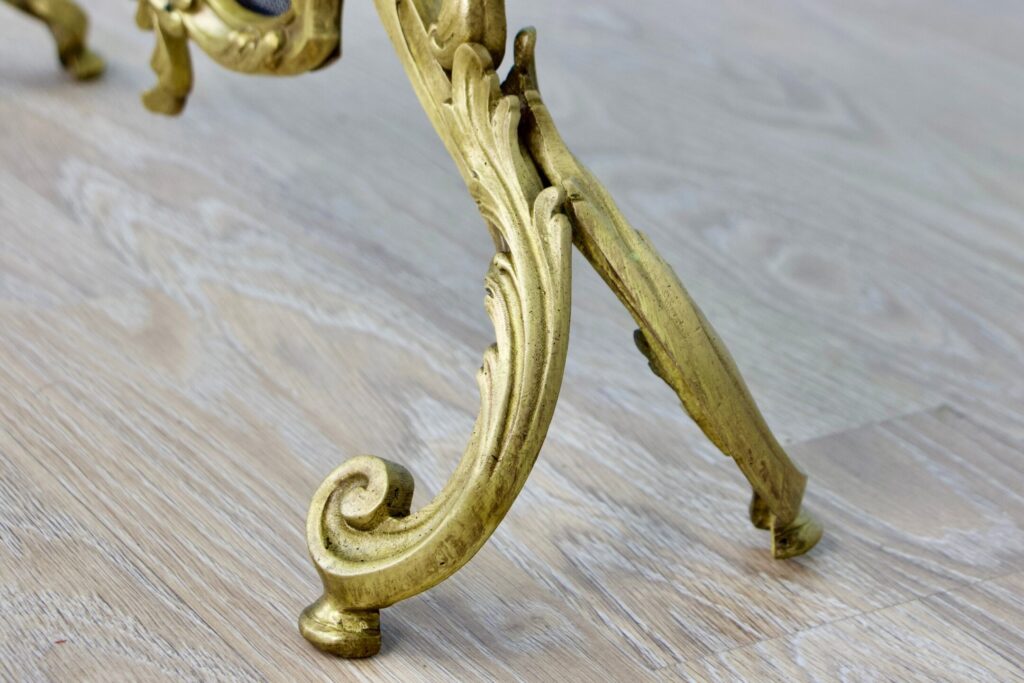 Витончений антикварний екран для каміна, фігурний каркас якого виготовлений з бронзи у техніці художнього литва, має вигляд суцільного рослинного орнаменту. Верхів’я решітки прикрашає барельєфна віньєтка з великою рокайльною мушлею. Екран стане чудовою прикрасою та доповненням до загального ансамблю класичного інтер’єру.