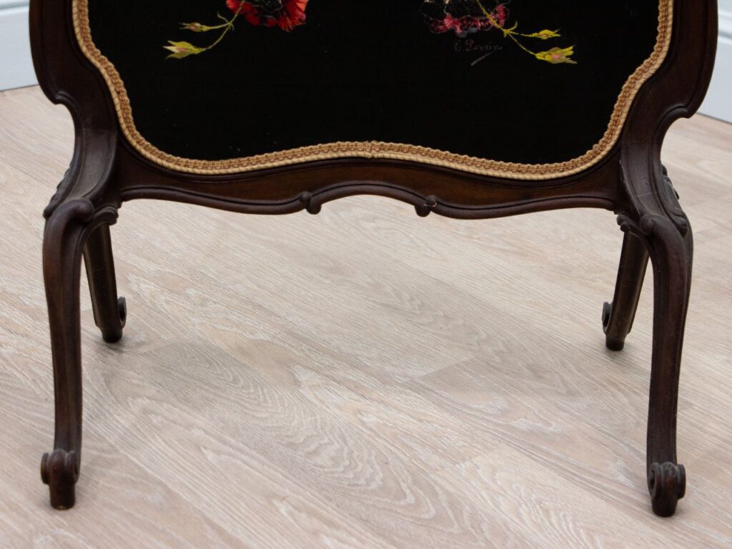 Antique fireplace screen carved from walnut and covered with silk fabric. Figured wooden frame, on four legs in beautiful execution. A bright bouquet of flowers acts as an accent against the background of a black silk cloth. The screen has a good condition of the wood, there are losses on the embroidery.