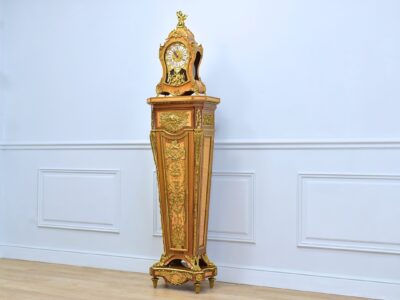 Старовинний камінний гарнітур з годинником та парою ваз. Виразним елементом виступає алегорична скульптурна композиція з левом та змією. Символізм, закладений в образи цих істот, відсилає нас до античної міфології. Майстерна деталізація скульптурної групи вражає. Металеві елементи встановлені на постаменти з мармуру. Механізм годинника захований під плінтом, а невеликий циферблат вдало вписаний в загальну композицію.