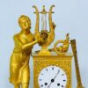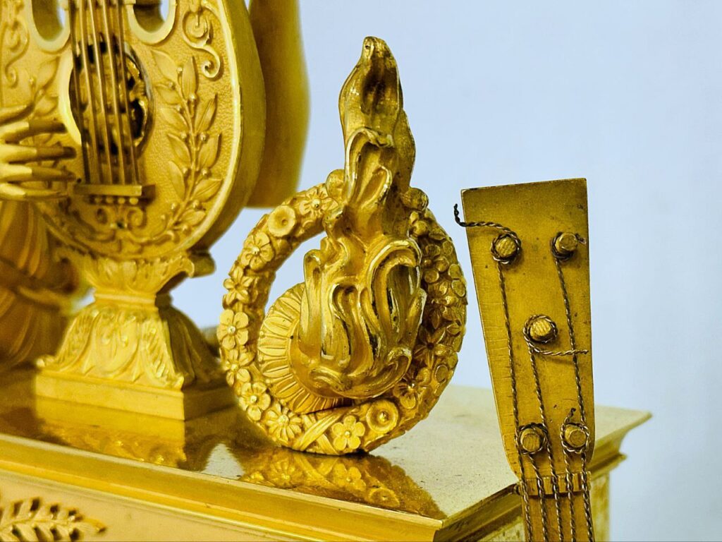 Розкішний антикварний годинник з художнього литва бронзи французьких майстрів, що виконаний у найкращих традиціях стилю Ампір. Бронза була основним матеріалом, що використовувався в годинниках у стилі ампір, який досяг свого піку популярності на початку ХІХ століття, а техніка патини та ормолу широко застосовувалася для прикрашання в цей період. Нижня частина предмету зроблена у вигляді постаменту прямокутної форми, фасад якого прикрашають окантовка з рослинного орнаменту та квіткові вінки з бантами й стрілами, а також барельєф, що зображає музичні інструменти, лебедя та шовкову стрічку, яка переплітає гілки оливкового дерева. Верхня частина зображена у вигляді корпусу з механізмом, на який спирається праворуч хордофон, а ліворуч прикрашає велична скульптура Орфея з лірою в руках, яка є дарунком від його батька, бога Аполлона. Годинник прикрашений порцеляновим циферблатом з римськими цифрами та оснащений механізмом з дзвінковим боєм, що сповіщає кожні 30 хвилин та певну кількість годин, заводиться ключем.