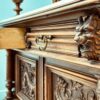 Антикварний креденс-поставець, головним акцентом якого виступає високий деревʼяний балдахін у готичних формах з різьбленими химерами та драконами, які прикрашають двері полиць та шухляди. Цей предмет стане гарним доповненням відповідного інтер’єру.