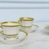Надзвичайний антикварний комплект чашок з блюдцями на чотири персони відомої Ліможської мануфактури. Чашки на ніжках зі стінками, що імітують поверхню іонічної колони, доповнені обідком, розписаним золотом, ручної роботи. Чудовий подарунок і прикраса для естетичної подачі напоїв за столом у колі друзів чи сім’ї.