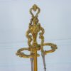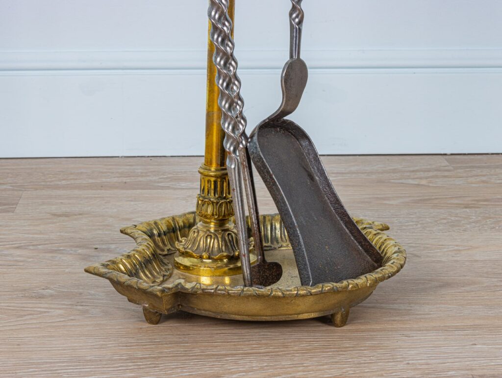 Чудовий антикварний набір для догляду за каміном з неймовірною бронзовою фурнітурою. У набір входять: підставка для інструментів, щипці для дров та лопатка для золи. Прекрасний бронзовий золочений декор прикрашає ручки предметів.