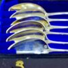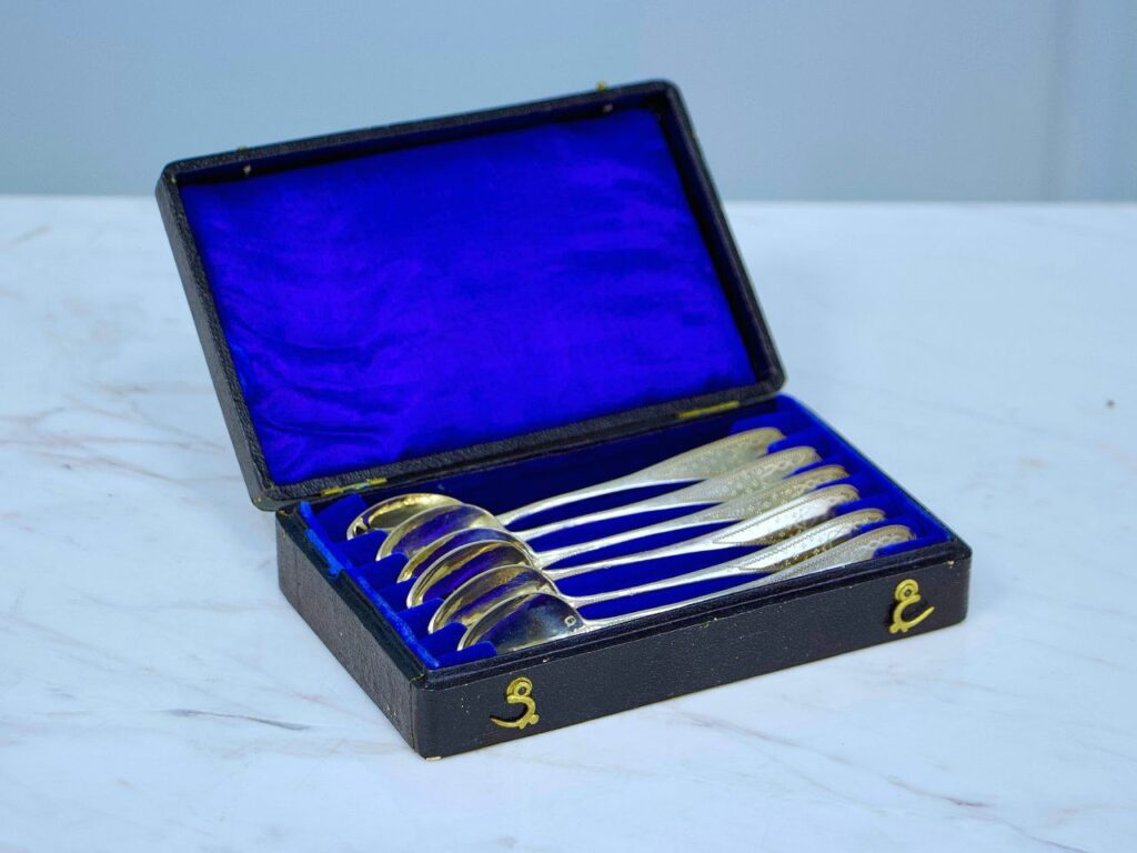 Антикварний набір з 6 срібних чайних ложок, виготовлених, ймовірно, до середини XX століття. Кожен предмет має клеймо Minerva, яке свідчить про якість срібла (925 проба) та маркування майстерні. Ложки мають лаконічне оздоблення у вигляді дрібних гравірованих крапочок. Набір чайних ложок у рідному кейсі з тканинною підкладкою.