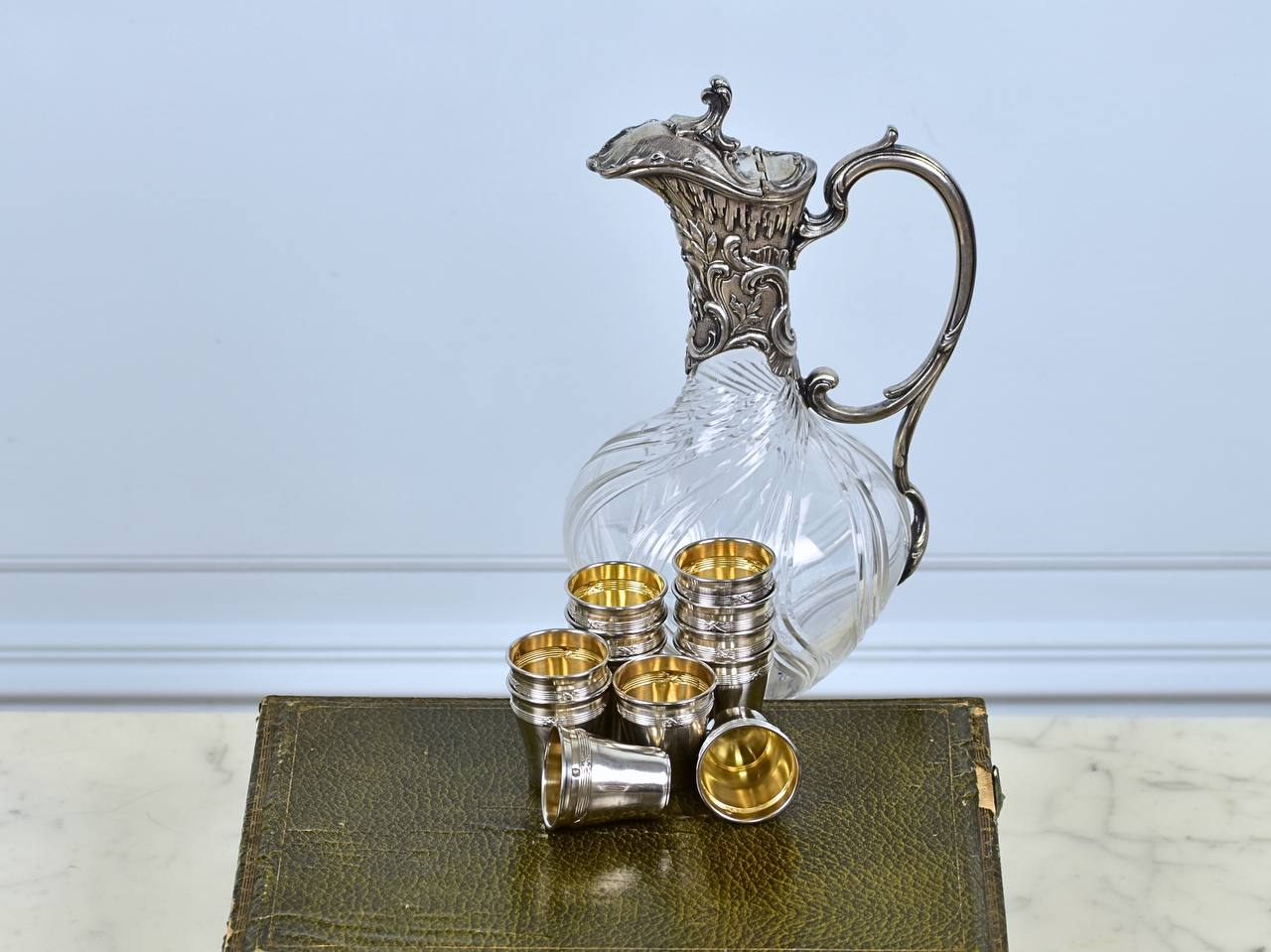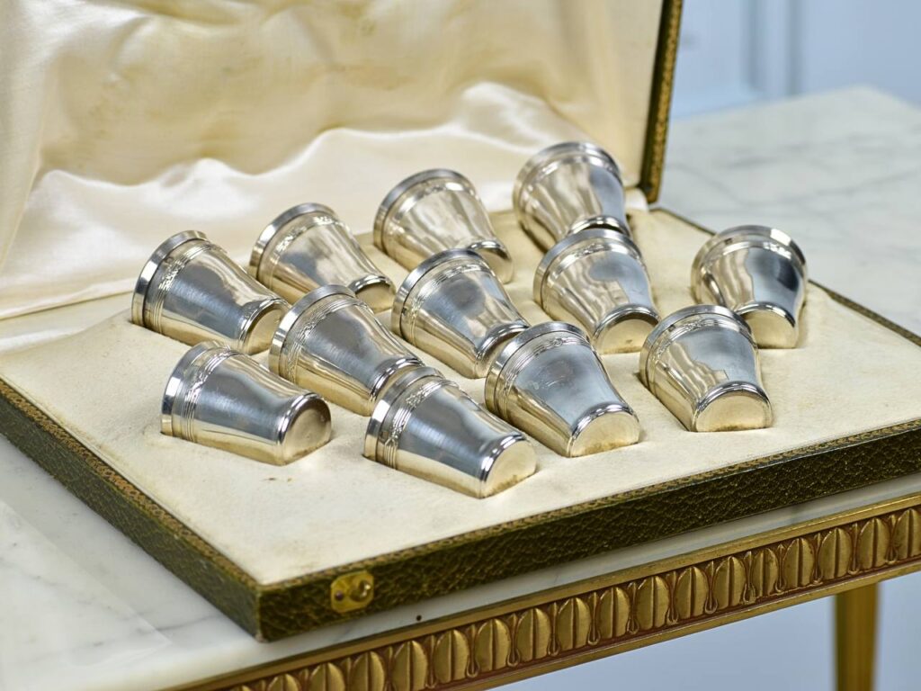 Антикварний набір з 12 рюмок зі срібла 925 проби в рідній коробці з відповідним маркуванням Minerva у восьмикутному картуші. Також присутнє маркування майстерні «C.B.», яка була зареєстрована в Парижі з 1905 по 1923 рік. Ювелірне виробництво процвітало завдяки своїм виробам модерного стилю, ближче до ар-деко. Всередині рюмки вкриті позолотою, яка дуже добре збереглася. Срібні вироби в хорошому стані.