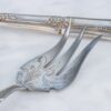 Антикварний посріблений десертний набір для сервірування в прекрасному виконанні та рідному кейсі. Чарівне гравіювання і прекрасний прорізний орнамент на лопастях предметів  поєднані з тонким литим рельєфом на ручках. Прибори виконані в стилістиці епохи Наполеона III. Клеймо Мінерва на шийці ручок та клейма майстра на лопастях. Загальна вага 145 грамів.