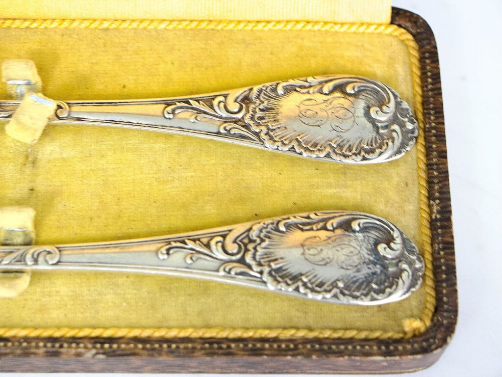 Старовинний набір срібних приборів виготовлений відомим виробником Emile Puiforcat. Відома фірма Puiforcat була заснована в 1820 році Емілем Пюіфорка, який працював зі своїми братами на вулиці Шапон у паризькому районі Маре. У 1857 році Еміль Пюіфорка разом із Жаном-Батістом Фуксом зареєстрували фірмовий знак компанії, який являв собою форму ромба в центрі кишенькового ножа в профіль, оточений ініціалами E та P (для Еміля Пюіфорка). Прибори були виготовлені на замовлення аристократичної особи, про що свідчать ініціали, вигравійовані на ручках. Даний екземпляр має стан, відповідний до віку.