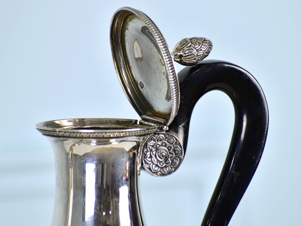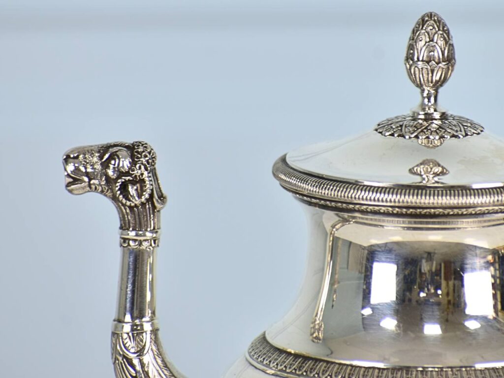 Неймовірний старовинний срібний набір для чаю та кави. В комплект входять чайник, кавник, молочник та цукорниця. Ручки виготовлені з ебенового дерева (зручно при використанні з гарячими напоями), кришки на чайнику та кавнику не знімні. Всі частини, включно з кришками та ніжками, марковані клеймом Minerva у восьмикутному картуші, що свідчить про високоякісне срібло 950 проби. На дні маркування ювелірної майстерні в ромбі, зображення відповідає мануфактурі «Edmond Tetard», яка працювала з 1880 по 1903 рік у Парижі. Срібний набір оздоблений в стилі ампір, про що яскраво свідчить використання єгипетської тематики (зображені голови верблюдів, левʼячі лапи та пальмети). На основі кожного виробу вигравійована монограма замовника. Такі прекрасні вироби зазвичай замовляла французька аристократія ХІХ століття. Сервіз у хорошому антикварному стані, срібло очищене від патини та відполіроване до чарівного блиску.