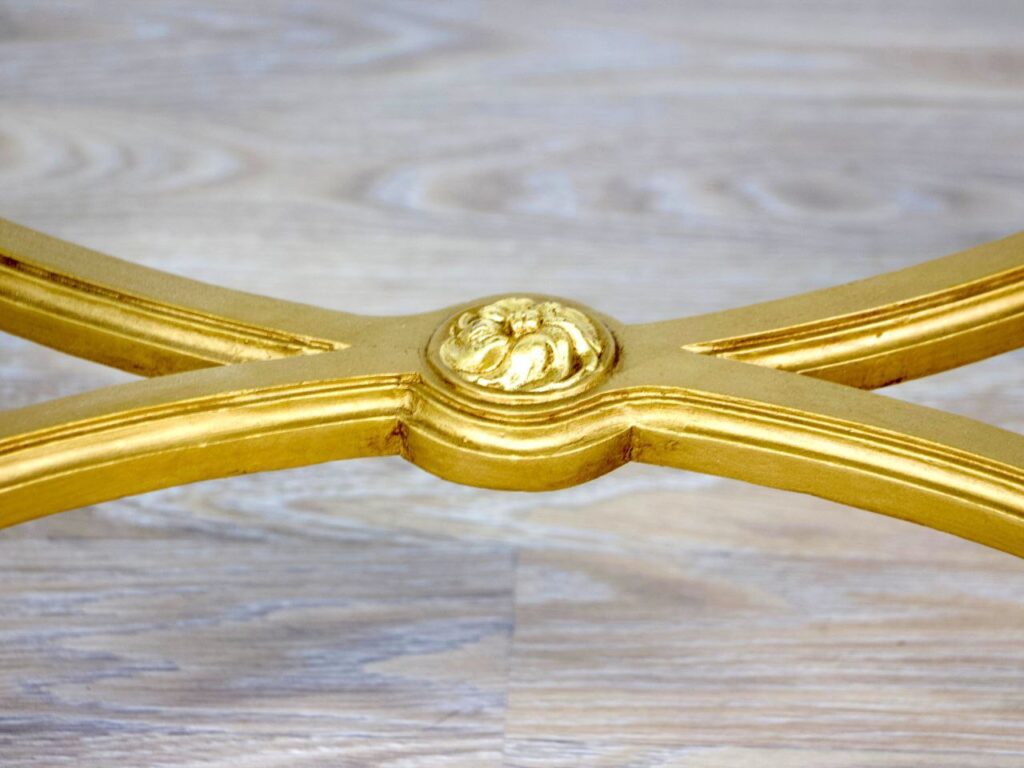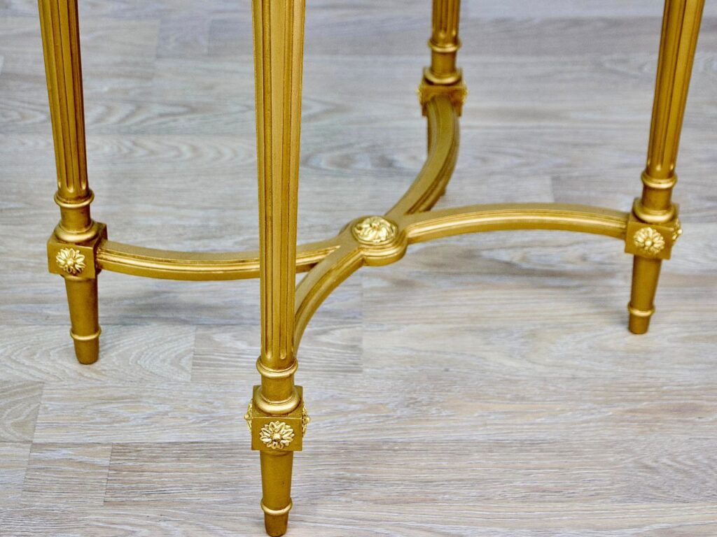 Розкішний антикварний столик із масиву дерева, виготовлений у стилі епохи Людовика XVI з відповідним основним декором у вигляді лаврового листя, переплетеного стрічкою, квітковими розетками та канелюрованими ніжками. Стільниця овальної форми виготовлена з суцільного зеленого мармуру. Універсальний предмет декору, який прекрасно доповнить класичний стиль інтер’єру.