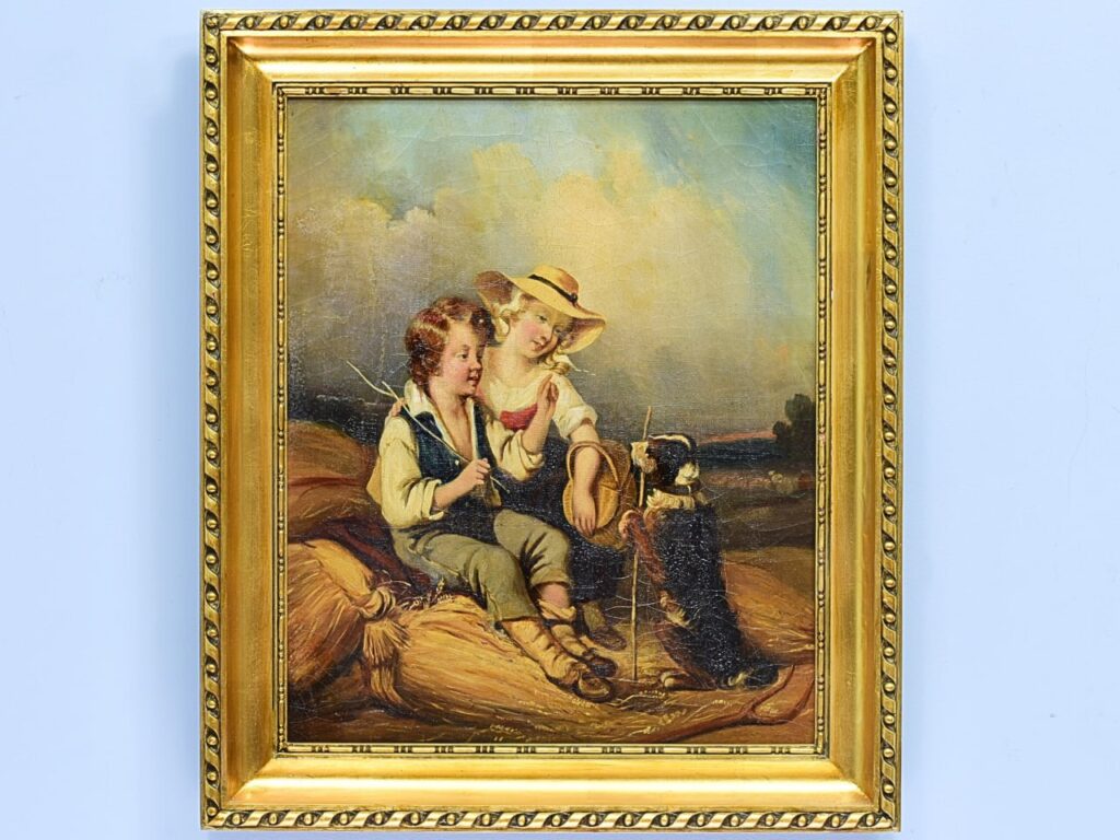 Антикварний живопис невеликого розміру з жанровим сюжетом, на якому зображені діти, які граються з собачкою. Картина датована і підписана на зворотному боці полотна. Твір створений у 1839 році та являє собою копію роботи англійця Річарда Панкеса Бонінгтона (Richard Pankes Bonington). Роботу вирізняє теплий глибокий колорит, хороша деталізація зображення і прекрасна композиція. Живопис обрамлений у дерев’яний багет.