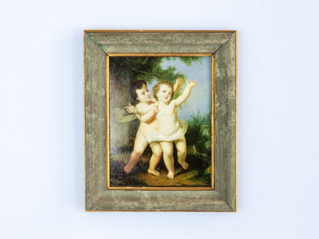 Невеликий за розміром антикварний живопис, на якому зображено двох дітей, які спостерігають за літаючим метеликом. Картина є копією роботи відомого французького художника ХІХ століття Гуго Мерле (Huques Merle 1823-1881 рр.). Живопис з прекрасним свіжим колоритом в техніці олійного живопису, виконаний на металі та обрамлений у лаконічну дерев’яну раму.