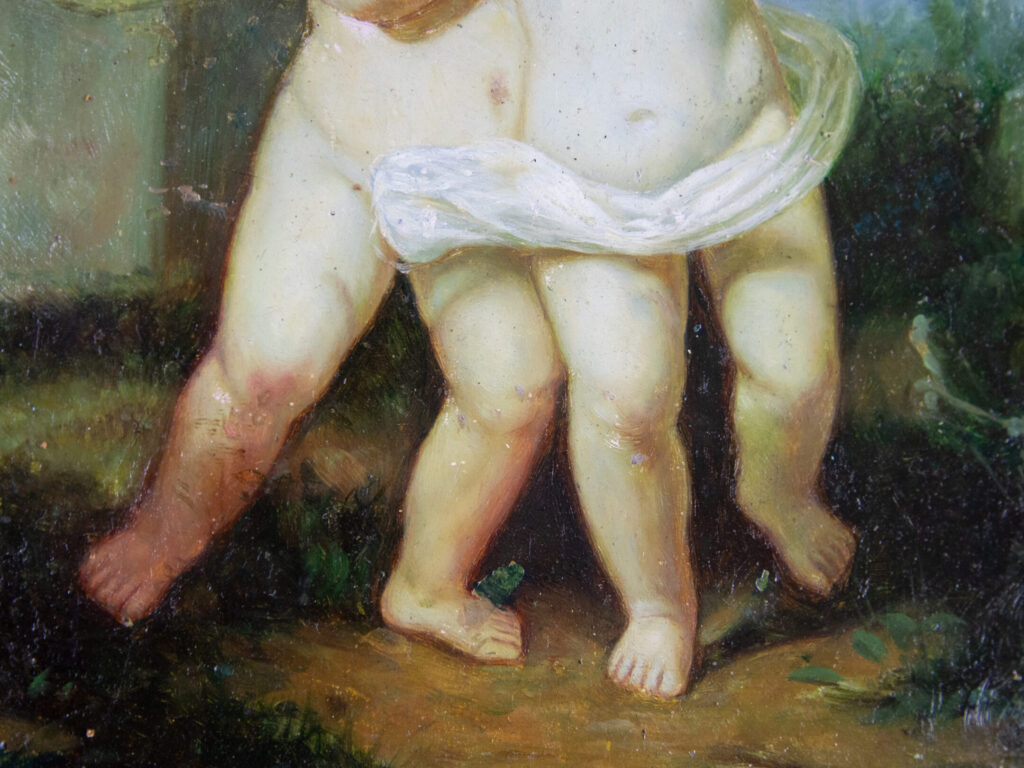 The small antique painting was created in the second half of the nineteenth century in France. It depicts two children looking at a butterfly flying by. The painting is a copy of the work of the famous French artist of the nineteenth century Hugo Merle (Huques Merle 1823-1881). The painting with a beautiful fresh color in oil painting technique is executed on metal and framed in a laconic wooden frame.