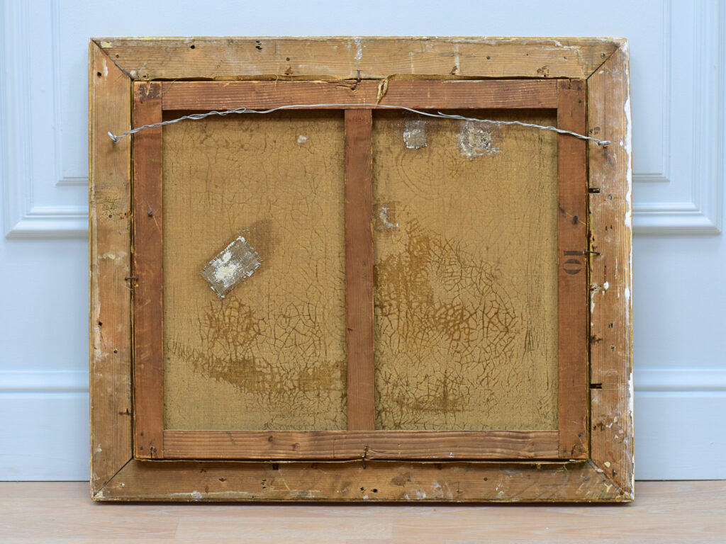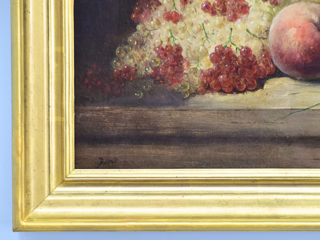 Антикварний натюрморт кінця XIX – початку XX століття, коли подібні прості мотиви в натюрмортах набули популярності. Тонко написаними натюрмортами, що часто рясніють персиками та подібними до нашого твору кошиками ягід, славився відомий французький художник Альфред Брюнель де Невіль. Однак приналежність даної роботи до пензля паризького майстра заперечується підписом невідомого автора у нижньому лівому кутку. Картина хорошої якості виконання, з теплим колоритом. Живопис обрамлений у лаконічний дерев’яний багет.